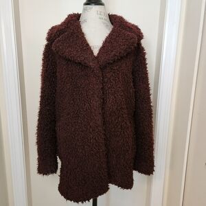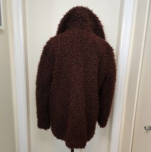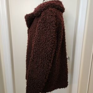 Thick curly purplish burgundy "mulberry" faux lamb fur teddy jacket with 3 snap buttons, by Celebrity Pink.