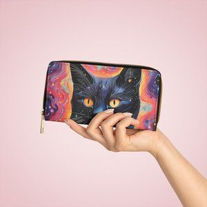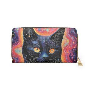 For carrying around all your credit cards, cash, and driver's licenses look no further than this personalized wallet. Made with cruelty-free faux leather, our trendy Celetial Cat wallet comes packed with utility and style.