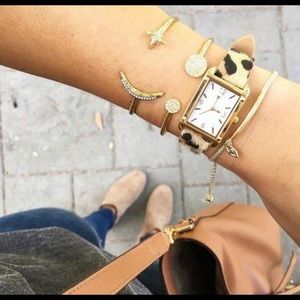 Hand-set Pavé in a ruthenium and shiny gold crescent climber joined with a shiny gold star with a hint of sparkle. Shiny Gold Plating Adjusts to fit SM-LG Wrists.