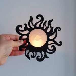 Set of decorative black metal tealight holders featuring sun and star designs. Creates a warm, ambient glow with a black finish. Perfect for tabletops or shelves to add elegant accent lighting.