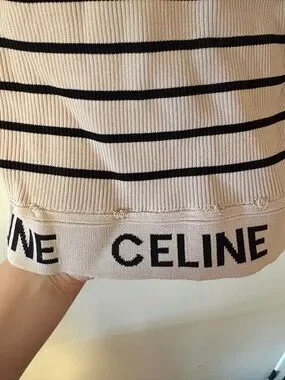 Classic Celine ribbed crop tank in beige with black horizontal stripes. Soft, stretch knit for a comfortable fit. Branded Celine band at hem for a designer finish. Easy-to-style piece that pairs well with high-waist jeans or skirts.
