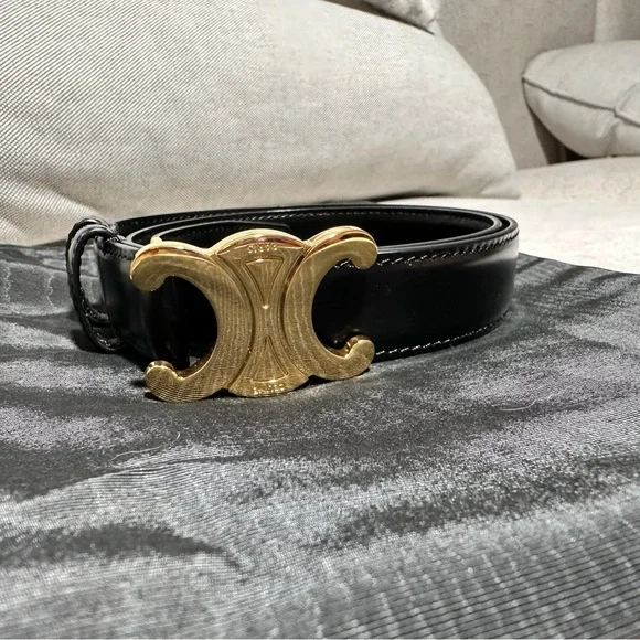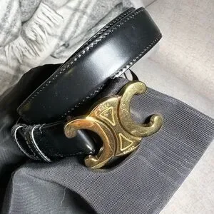 A Celine Triomphe black leather women’s belt in size 70, the smallest size available. This authentic piece features a gold-tone buckle with subtle vintage-inspired distressing and minor scratches, adding to its character without affecting functionality. The leather strap itself is sleek and glossy, showing minimal signs of wear with only a few faint scratches that are barely noticeable. Overall, the belt is in excellent condition, having been worn sparingly. A timeless and versatile accessory that reflects Celine’s signature craftsmanship.