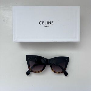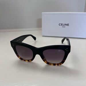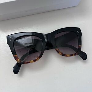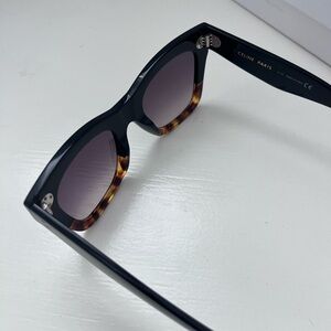 Stylish Celine sunglasses with a bold black frame. Tortoise accents add a unique touch.