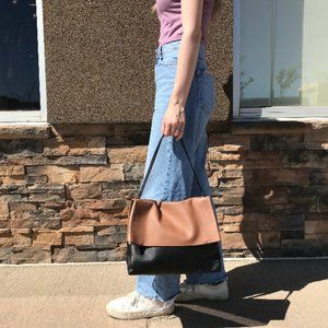 This elegant tote is crafted of three tones of supple calfskin leather in black, ivory, and brown. The top handle is crafted of a smooth, flat, black leather strap and secures without hardware. The flap opens to a spacious brown suede interior. This is an excellent tote suitable for many occasions, from Celine!