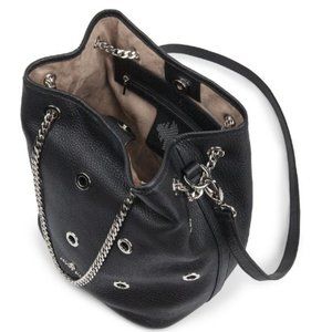 A trendy and modern twist on a shoulder tote, the Celine Dion Falsetto collection's leather handbag has a eyelet-accented exterior with chain-style shoulder strap in a very modern free-form cut with interior with quality lining and room for cosmetics, pocketbook, smartphone and other daytime essentials.