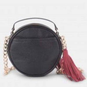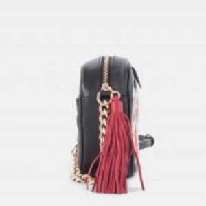 Mini crossbody bag features zip top entry with crimson red tassel zipper pull