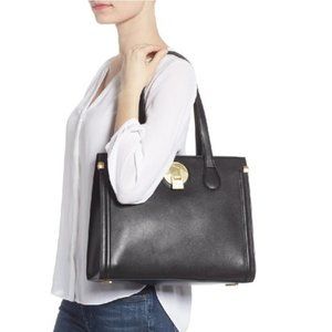 The Octave has timeless silhouette with geo embossed gold-tone hardware and a roomy interior.