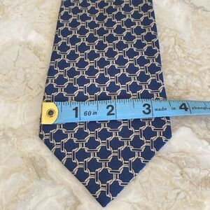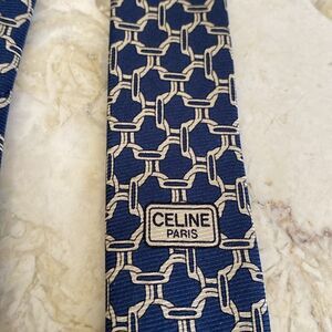 In excellent preowned condition classic Celine Macadam tie in 100% silk. Elegant dark blue base with grey macadam pattern.
