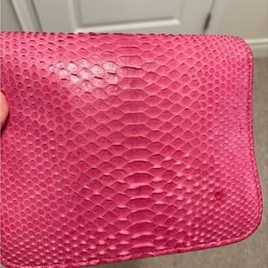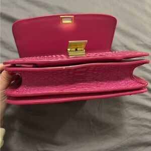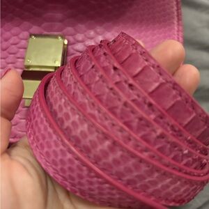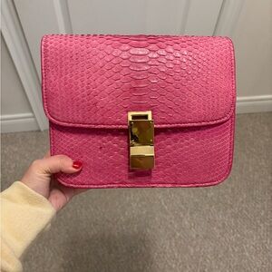 Elegant pink crossbody bag with genuine python Skin. Features a sleek gold clasp. Ideal for a stylish look.