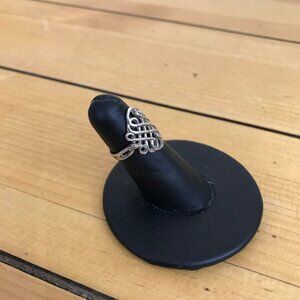Vintage 90s ring has a Celtic-style infinity knot design. Inside of band is stamped "875" PAJ (Prime Art & Jewel). Length of Celtic knot is approx. 3/4". US ring size 5. Good pre-owned condition, silver has some toning from age (can be polished).