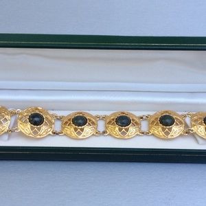 This piece of Irish jewellery consists of a series of genuine Connemara marble cabochons that are set into a gold tone link bracelet. The Connemara marble beads are a dark shade of green and polished to a high shine using a natural bees’ wax polish. The bracelet has a Celtic design within the piece and comes in its own presentation box.