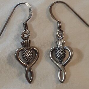 Preowned and good condition. Stunning Celtic Scottish Thistle drop earrings. Fish hook style. Earrings are .75 inch in length. 925 Silver. Beautiful and unique.