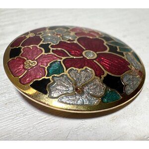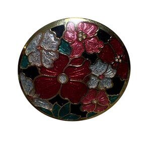 This brooch combines intricate floral enamelwork with a gold-tone base, making it a sophisticated addition to formal and casual attire.