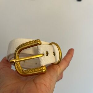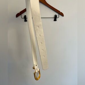 Enhance your style with this elegant white belt featuring a striking gold buckle. Perfect for adding a touch of western cowgirl to any outfit. Light sign of wear still perfect to use