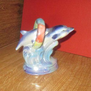 This is a small ceramic decoration with 2 dolphins playing on it in great shape with no cracks / chips, no noticeable damage either except maybe the odd scratch or paint markings on the bottom. It comes as is and will be well packaged to protect it on it's travel if bought.