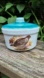 Charming ceramic mustard dish featuring a bird design. Comes with a vibrant turquoise lid. There is some crackling.