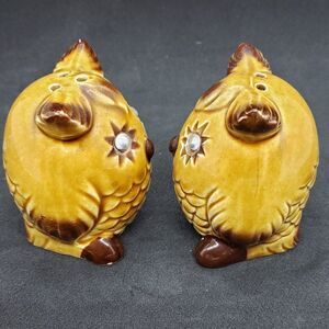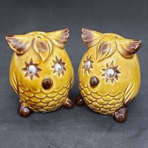 Ceramic Gold Owl Creamer and Salt & Pepper Set - Japan - EUC and approx. size: 5.25" (w) x 3.5" (l) x 4" (h). No chips, cracks, scratches or crazing on this adorable and fun serving set that is retro/vintage 1970's! This wonderfully whimsical set is an absolute must-have, especially since it is in fantastic condition given its age!