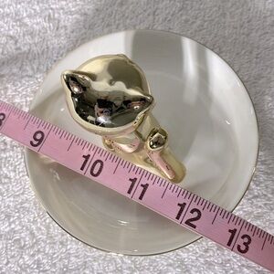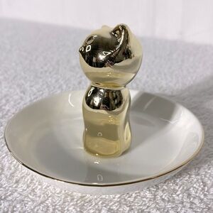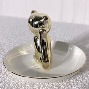 Elegant gold cat ring holder on a white dish. Perfect for organizing jewelry.