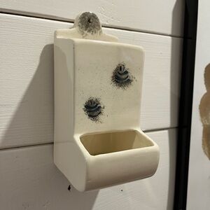 Charming vintage ceramic wall-mounted match holder with hand-painted accents in dark blue and earthy tones. A few minor imperfections (see photos) add to its rustic appeal. Perfect for vintage kitchens, cottages, or as unique farmhouse-style decor.