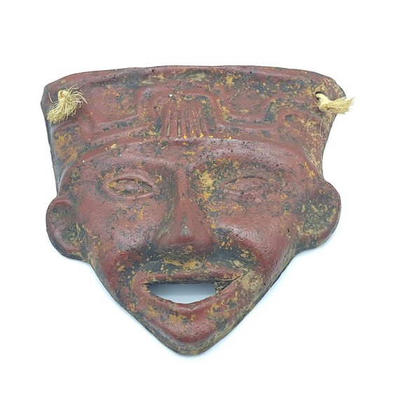 A ceramic Mayan wall mask that was made in Mexico (it has a sticker saying "Maya, Rivera, Mexique). The piece is mostly red and looks like it was made with an eye to making it look old.