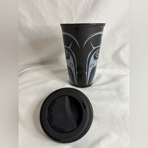 Native ceramic coffee/tea cup with lid, holds 12 oz , measures 4” wide at the lidded rim x 6” high.