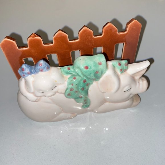 Ceramic Pig Napkin Holder Pink Piglets Fence Vintage Farmhouse Hand Painted