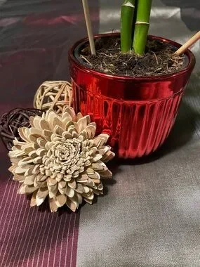 Festive red planter features glossy finish and decorative accents. Washed & Cleaned *PLANT NOT INCLUDED*