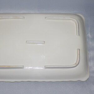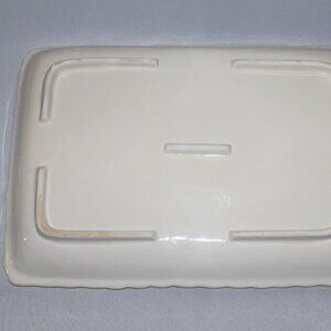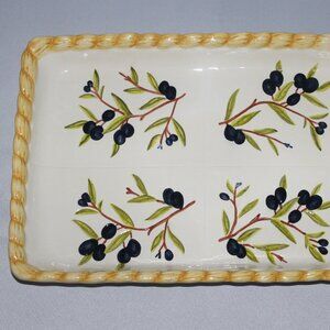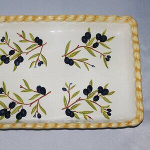 A lovely serving platter with a pattern of black olives on brown stems with green leaves. The rim has a braid appearance. The platter is in very good condition without any cracks or crazing. There is a tiny chip on the underside as indicated in the photo, but it does not affect appearance or function.