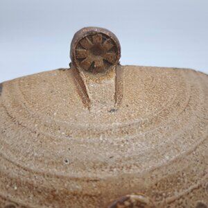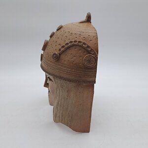 A large ceramic wall mask made by an artist named Raylin in 1979. I am not sure what it depicts as to my eyes it could be anything from a soldier in a helmet with a nose guard to a woman in ceremonial head gear to someone in traditional costume. The mask's face is decorated with what look like rivets and stars.