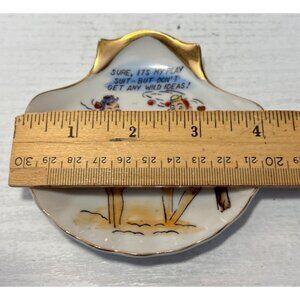 This vintage ceramic trinket dish features cheeky adult humor, ideal for a playful touch to any room. With a unique shell design, it's perfect for holding small items or as a decorative ashtray. A fun conversation starter for those with a sense of humor.
