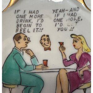 This vintage ceramic trinket dish features a humorous cartoon design, complemented by a gold trim. Ideal for collectors or as a unique decorative piece.