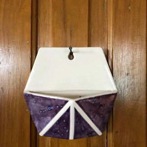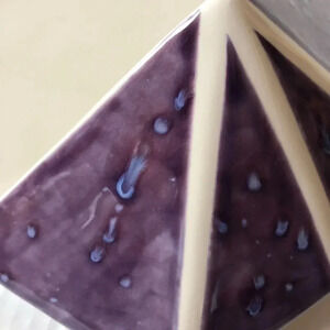 White ceramic base with purple and blue drip glaze on top. Super cute colour combo, really stands out!