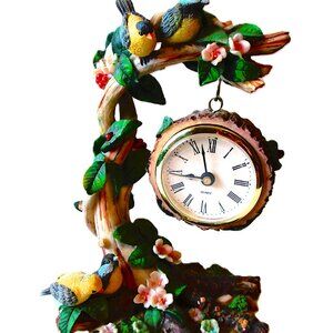 Vtg Ceramic precious yellow & blue small bird pink flowering blossoming handing branch tree clock with replacable battery. A really special piece. The piece has a lot of pretty sweet detail. Measurements: 8" High x 6" Long x 4" deep. Perfect for the bird enthusiasts. This is a combination of decor,birds & a clock. Look great in any sweet niche. A collector piece for the bird clock enthusiasts. Nice on your piano, etc.