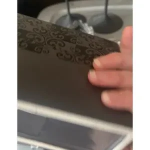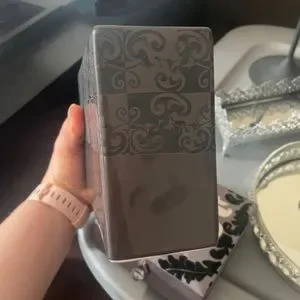 Glossy dark gray with a printed pattern along the top edge. There’s a checkerboard element to the damask pattern that is unique & complements other items in my closet.