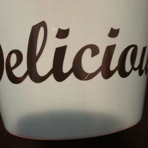 The dish is all black inside. And light blue with black writing on one side. Which reads “ Delicious “.