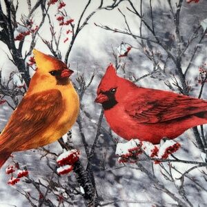 Ceramic decorative plate featuring two beautiful cardinals in all their winter splendour. 12.5” x 12.5” (approximately 25” around). Includes hanging bungee cord.