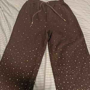 Clean black set with all-over rhinestone detailing that shines crazy in person and under flash. It has that bold luxury streetwear vibe and is definitely a standout piece.