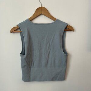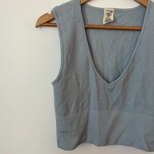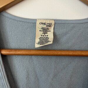 C’est Moi ribbed knit cropped tank in a soft blue shade. Features deep V-neck, wide straps, and stretchy bamboo blend fabric (80% rayon from bamboo, 17% nylon, 3% spandex). One size fit — comfortably fits S/M. Excellent condition, gently worn.