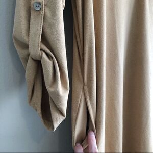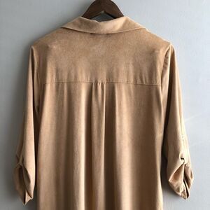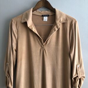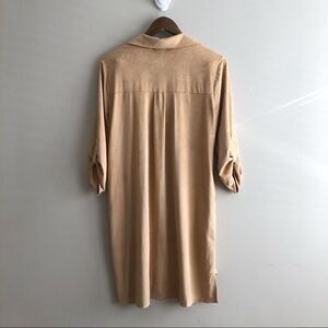 Cha Cha Vente Soft Suede Flowy Relaxed VNeck 3/4 Sleeve Mini Dress Tan