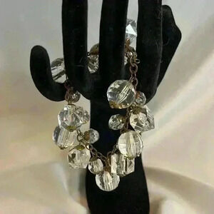 From my collection.. Clear cha.. cha…cha bracelet.. the name comes from the movement of the wrist when moved.. hence the cha.. cha.. cha name…various shaped acrylic beads are secured to a matte bronze chain…measures 7” long with a lobster claw clasp.. no issues