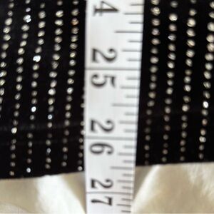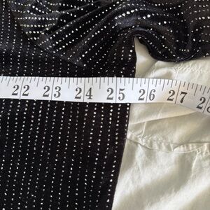 Elegant and stretchy black velvety long-sleeve top by Chagall featuring a subtle vertical silver metallic stripe pattern that catches the light beautifully. Soft, comfortable, and perfect for evening wear, holiday parties, or dressing up a casual look.