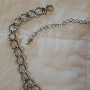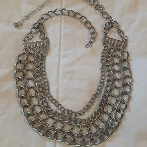 Pre-owned and good condition. Silver tone necklace featuring 4 different styles of hanging chains. 22 inches in length. Edgy statement necklace.