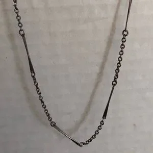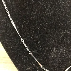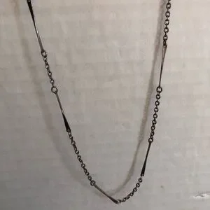 9” in length, not adjustable. Unmarked so it’s likely costume jewelry. Super unique twisty metal portions, not just your standard chain.