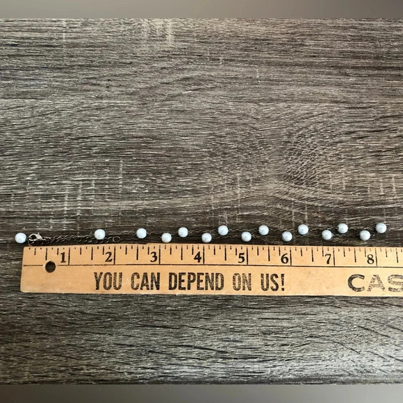 Silvertone chain necklace with faux (I believe glass) pearl beads. The pearls almost have a slight blue tinge to them.