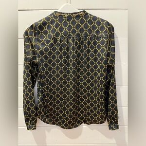 Chic and elegant blouse by Michael Kors in black with a golden chain print. Features a split neckline with decorative gold-tipped cords and long sleeves. Size XS.