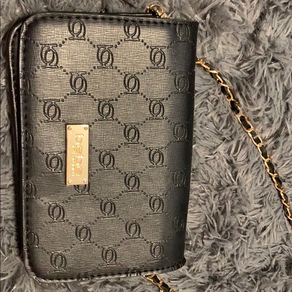 Black crossbody bebe purse with gold and black chain