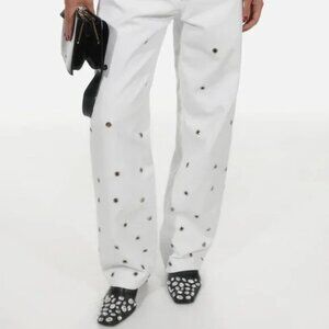 Straight-leg organic cotton denim jeans in white. Silver-toned metal eyelets pattern over the front. Mid-rise. Five-pocket styling. Belt loops at waistband. Zip-fly. Tonal stitching.
