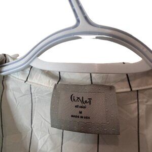 this Chalet et Ceci white jacket features a classic jacket-style collar and a full button-down front with black buttons. It has 3/4 length sleeves and large patch pockets visible on the lower front of the garment, adorned with a striped pattern.
