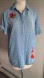 Chambray top with collar and open v-neck. Has red embroidered flowers on one shoulder and hip. Short sleeves can be worn down or rolled up with button tabs. Has pockets! Made of 100% tencel.