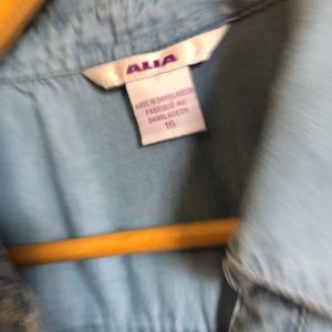 Alia short sleeve button up front. Love the design, beautiful embroidery, but doesn't quite fit. Tag says 16 but fits more like a 14. Beautiful embroidery. Denim blue color. Material is 100 lyocell. Approximate measurements are 23" armpit to armpit, 27" neck to hem. Excellent used condition with no damage.